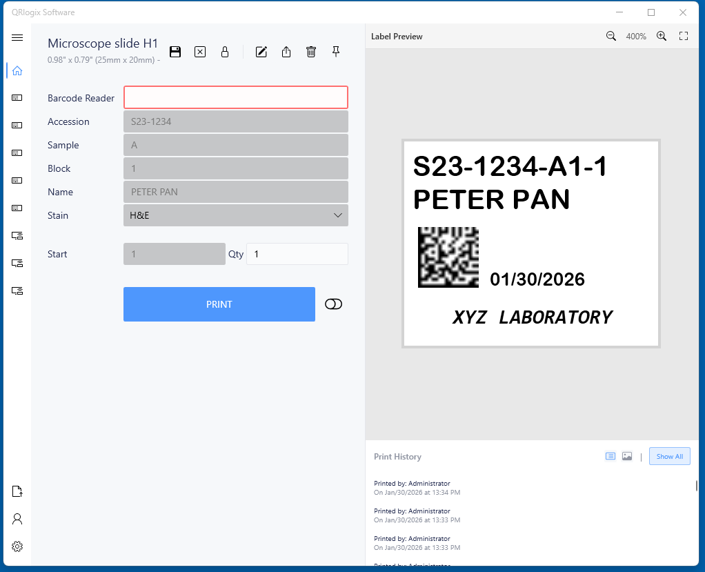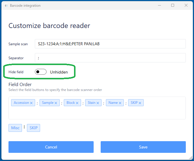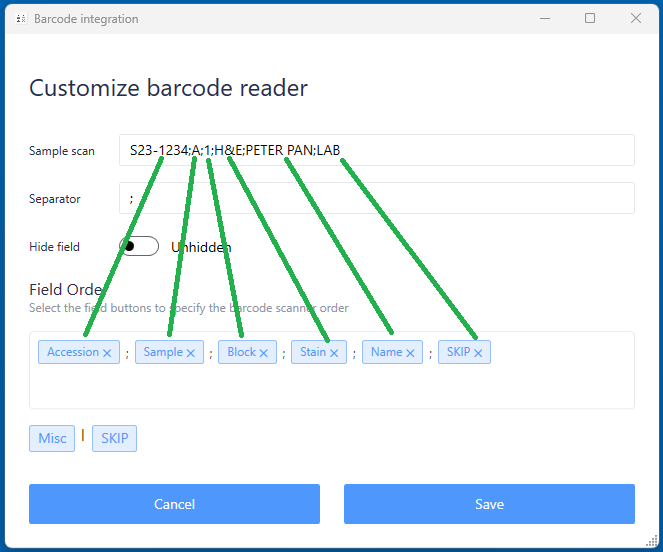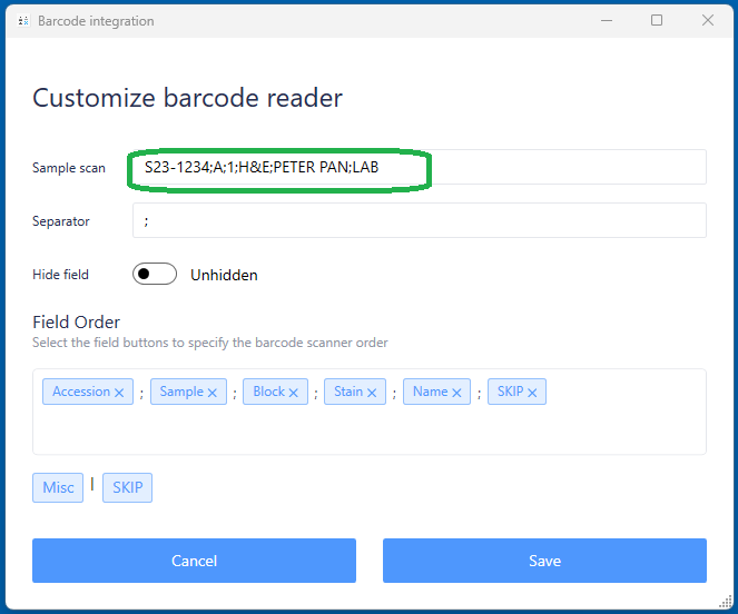 Example Barcode: S23-1234;A;1;H&E;PETER PAN;LAB