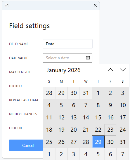 To add a date picker, click on the calendar and select a date. This is used for sample data. Click create. Make sure you add the field to the label in Label Builder.