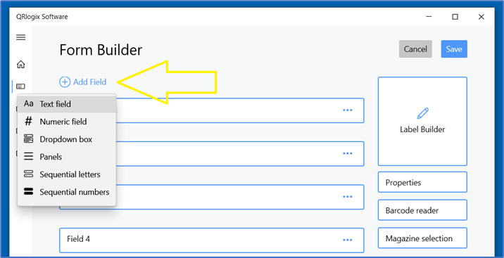 To add fields or dropdown boxes to a form, select the Add Field option at the top of the window