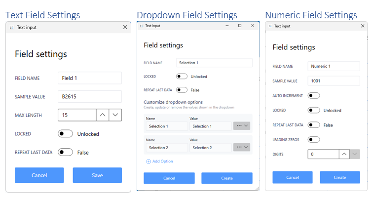 REPEAT LAST DATA: Field data automatically repopulates after printing.