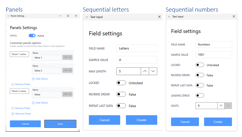 From the Customize Template screen, you can add and remove template features such as Text fields, Numeric fields, Dropdown boxes, Panels, and Sequential letters, Text Boxes and Date Pickers. You can also change the name of a template, add printers to a template form dropdown, setup a barcode reader, and connect to APIs.