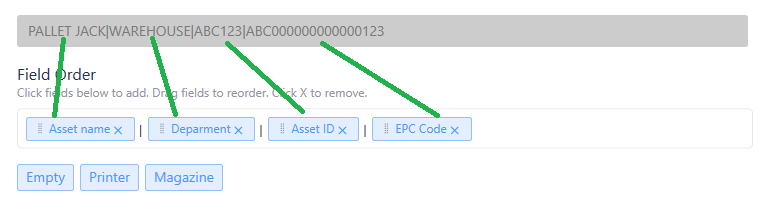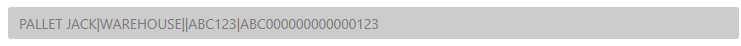 Example: PALLET JACK|WAREHOUSE|ABC123|ABC12300000000000123