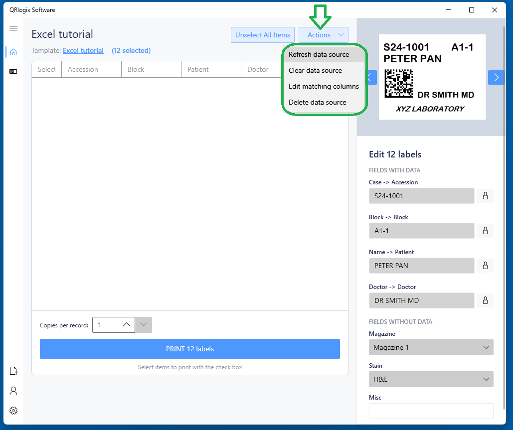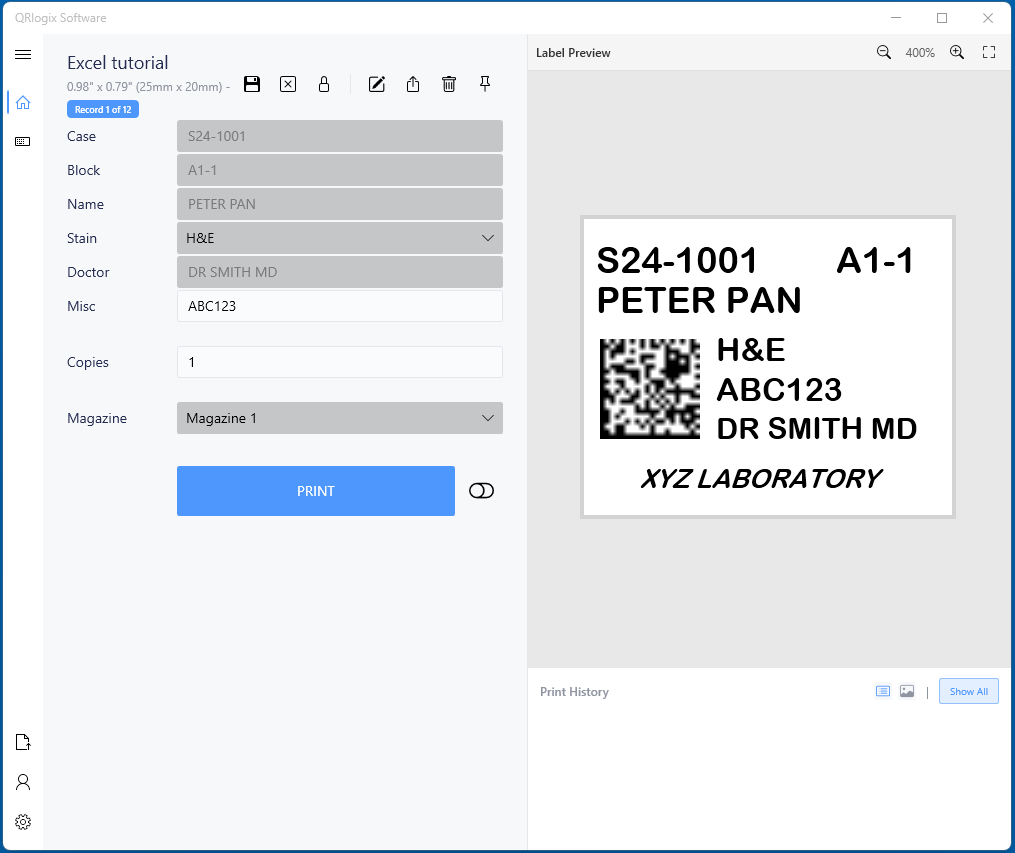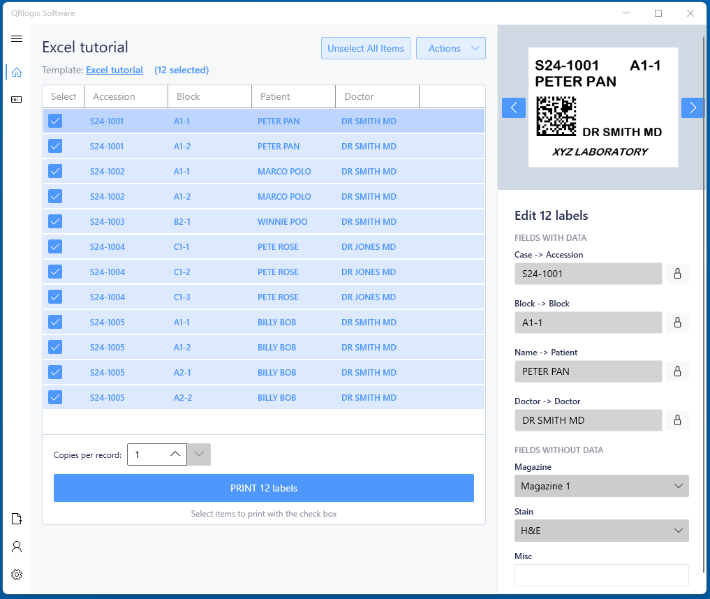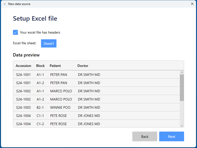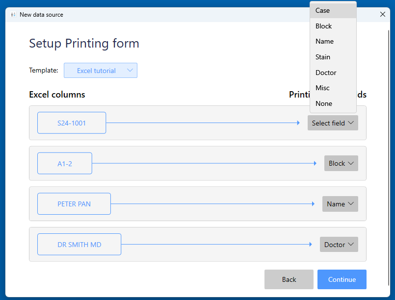For the example above, the Case, Block, Name and Doctor fields will receive data from the Excel spreadsheet. The data will route from the Excel columns to the corresponding template fields, and then to the label.