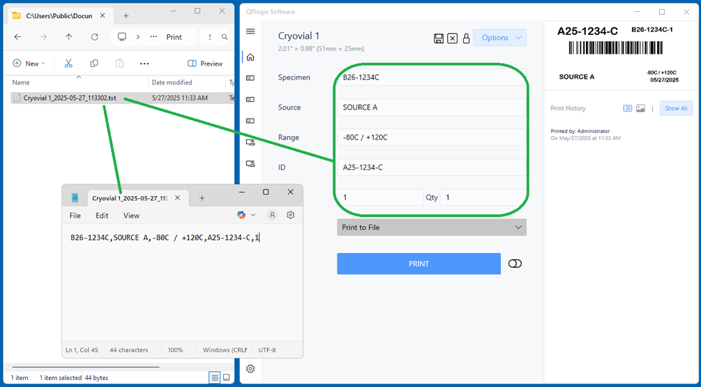 Users can send print jobs as strings of data, within text files. These print jobs get sent to a shared folder that is monitored by a printer. When a new print job text file hits the folder, it gets printed out on the printer.